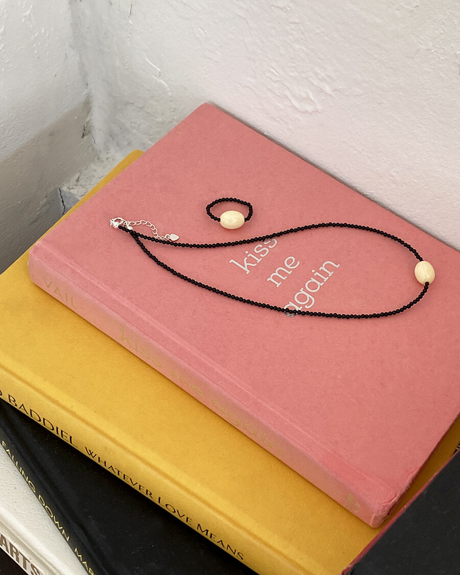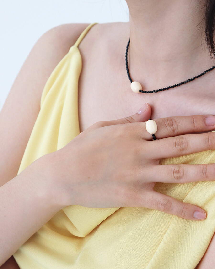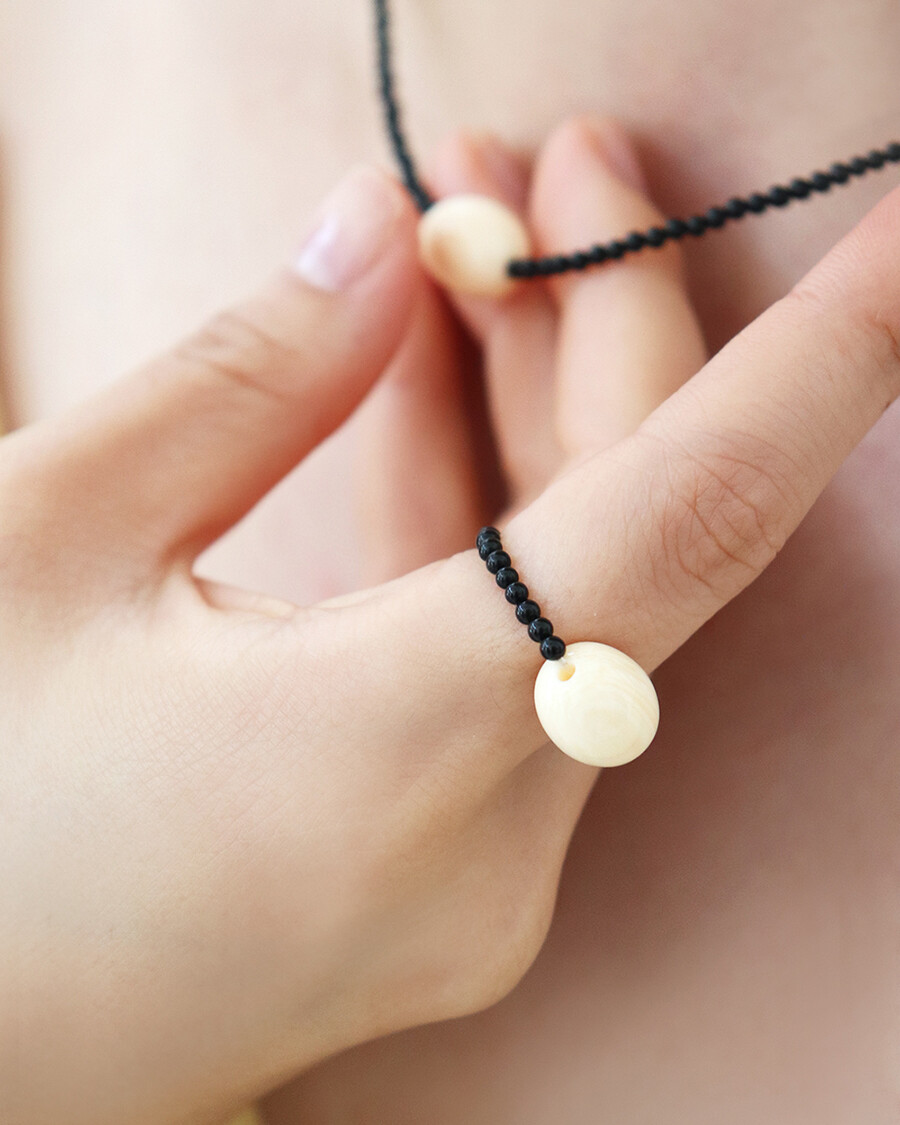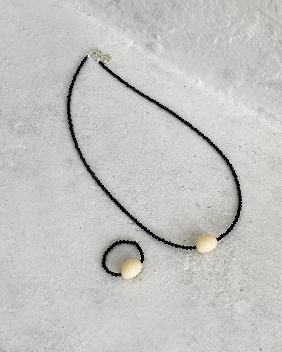 정교하게 깎은 오닉스 비즈 줄 중간에 상아 파우더를 압축한 오묘한 무늬의 타원형 팬던트를 넣은 제품입니다.